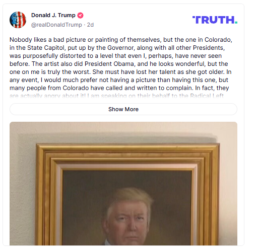 Using his platform, Truth Social, Trump criticized the portrait painted by artist Sarah Boardman, displayed at the Colorado State Capitol since 2019. He felt that the artist portrayed former President Barack Obama much more favorably in comparison, which added to his dissatisfaction.