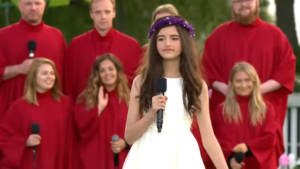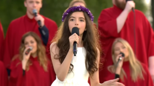 As Angelica steps onto the stage at Fredriksten Fortress, she announces she will be singing an Elvis song, and the audience’s excitement is palpable. She begins with “Now or Never,” a challenging song that she handles with remarkable maturity. Angelica’s rendition stays true to the classic, hitting every note with precision. Her voice so closely resembles Elvis’s that it’s astonishing to hear such talent from someone so young.