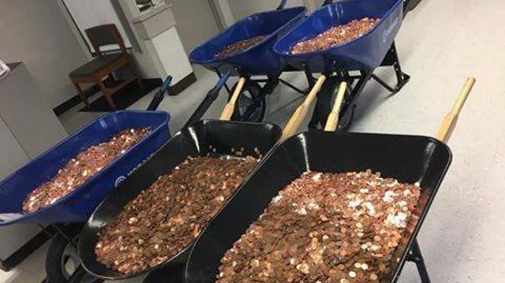 They brought the gallons to the bank and the employees had a fun day experiencing something they’ve never done before. They cut out the pennies out of the water jugs using a hammer and an ax. After five hours of cutting and counting on the coin-counting machine they had a number.
