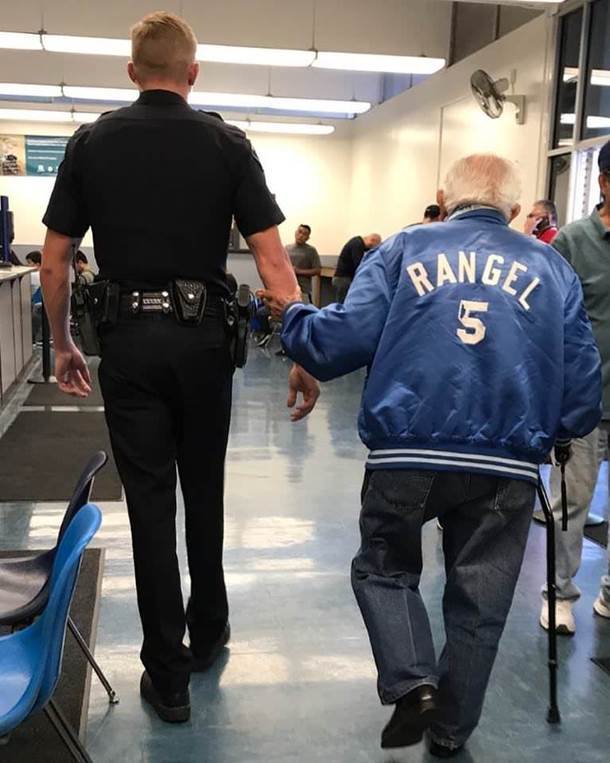 The officer decided to help the elderly man rather than simply kick him out of the bank.