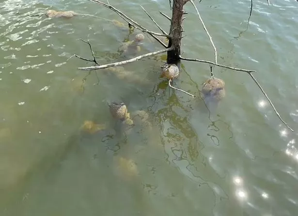 These pods are hanging from tree roots, and actually help clean the lake