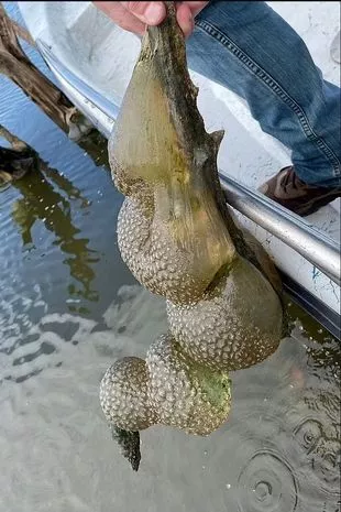 The Oklahoma Department of Wildlife Conservation (ODWC) shared the photos on social media. “What is that??? If you’re out boating somewhere like McGee Creek Reservoir you may notice these strange jelly-like balls hanging from submerged tree limbs,” begins the post.